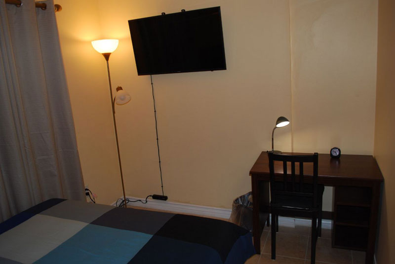 THE ROOM is a small bedroom with a queen size bed, 4K TV with Netflix and ROKU, closet with hangers (in the hallway), working/dressing desk, hair dryer, WiFi, and alarm clock.