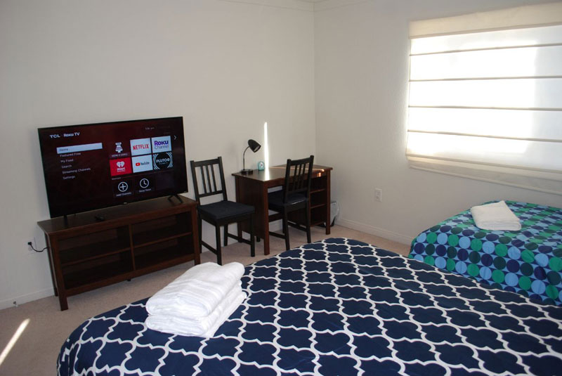 THE ROOM is a bedroom with a queen size bed, single bed, 50" 4K TV with Netflix and ROKU, built-in closet with hangers, working/dressing desk, hair dryer, WiFi, and alarm clock.