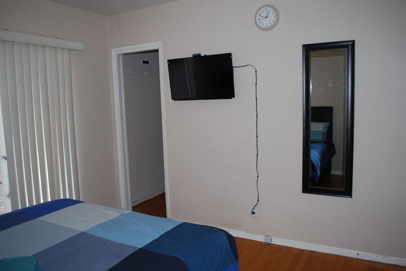 PRIVATE ROOM is a private bedroom with a queen size bed, hardwood floor, TV with Netflix, nightstand with decorative lamp, closet with hangers, working/dressing desk with mirror, hair dryer, WiFi, and alarm clock.