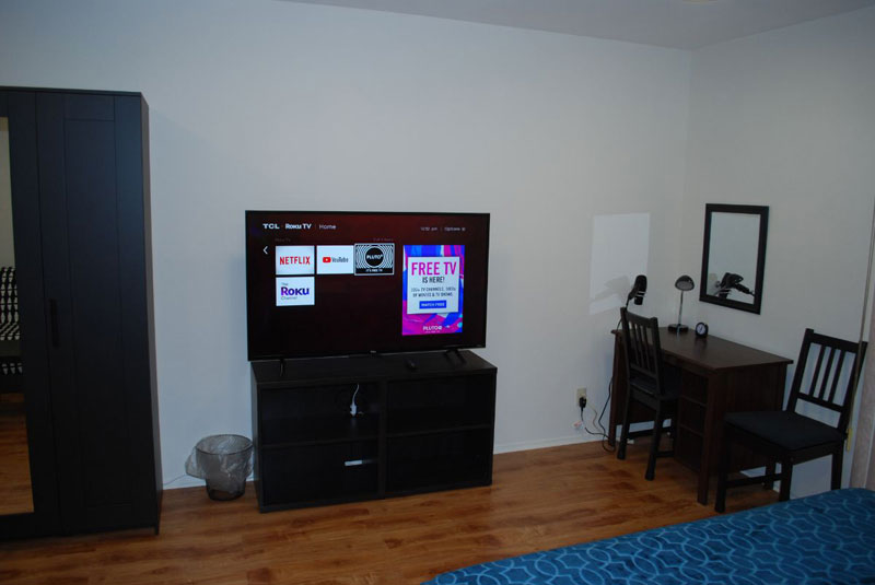 ORANGE ROOM is a private bedroom with a queen size bed, sofa bed, hardwood floor, nightstands with decorative lamp, wardrobe with hangers, working/dressing desk, hair dryer, WiFi, 55" 4K TV with Netflix, Roku and Pluto TV, and alarm clock.